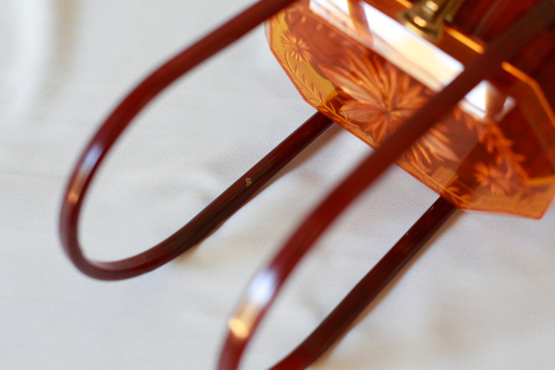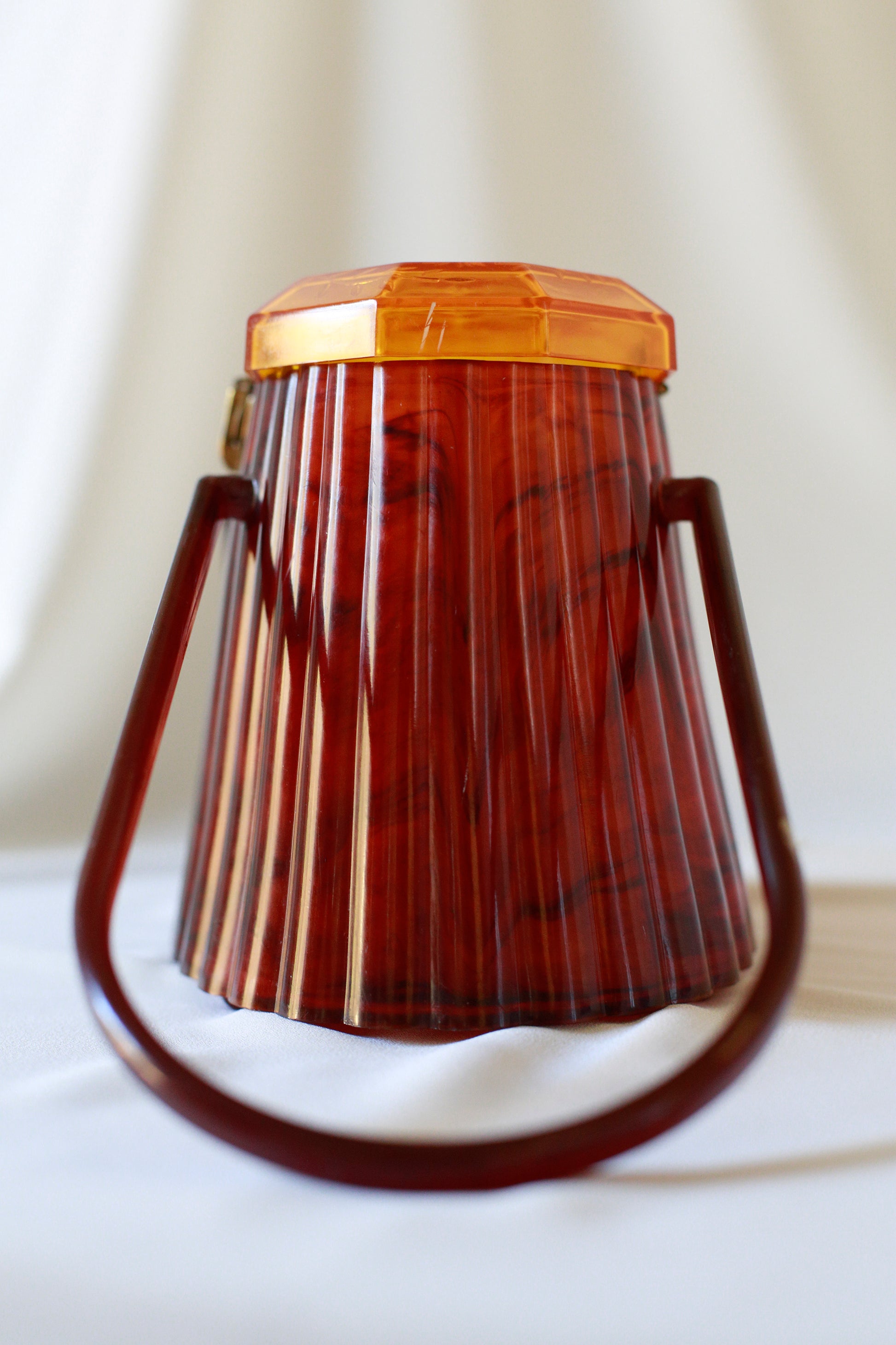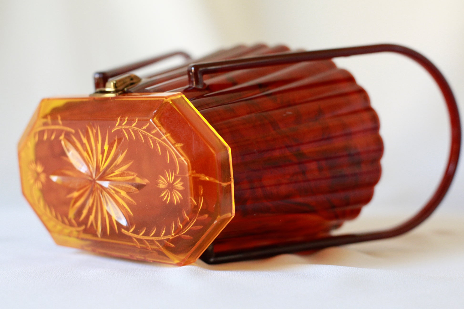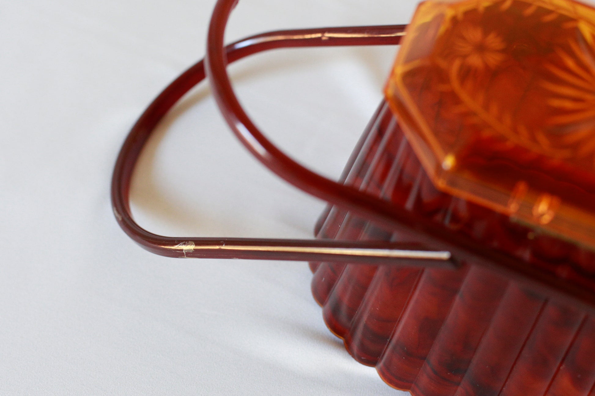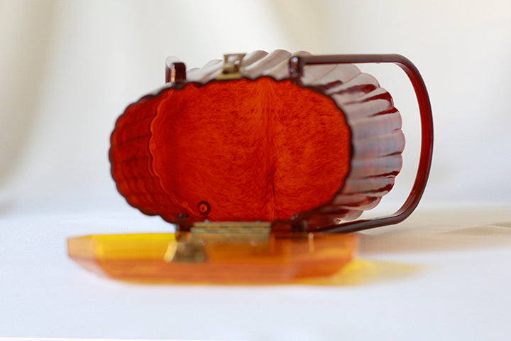 This beautiful handbag dates to the 1950's. Although the materials may not be true Lucite, it is a very beautiful and culturally significant piece. The handles move smoothly and the clasp opens with ease. There are some small white marks on both sides of the bag (pictured) and a small crack on the top lid (also pictured), but none of these imperfections are jarring and can only be seen when studying the bad up close. There is some small wear in the plastic on the handles (pictured), but all in all the color combination is truly stunning.