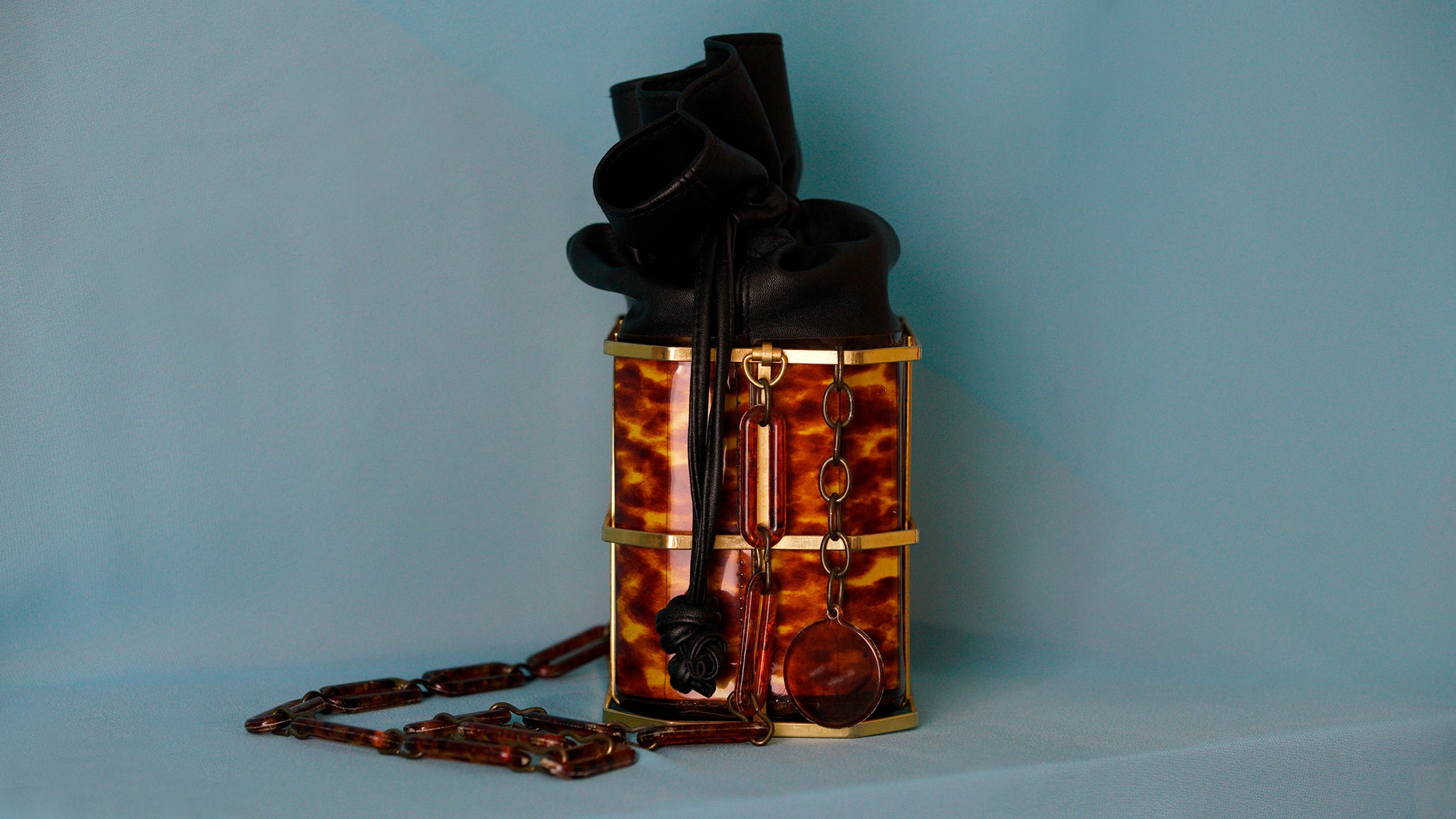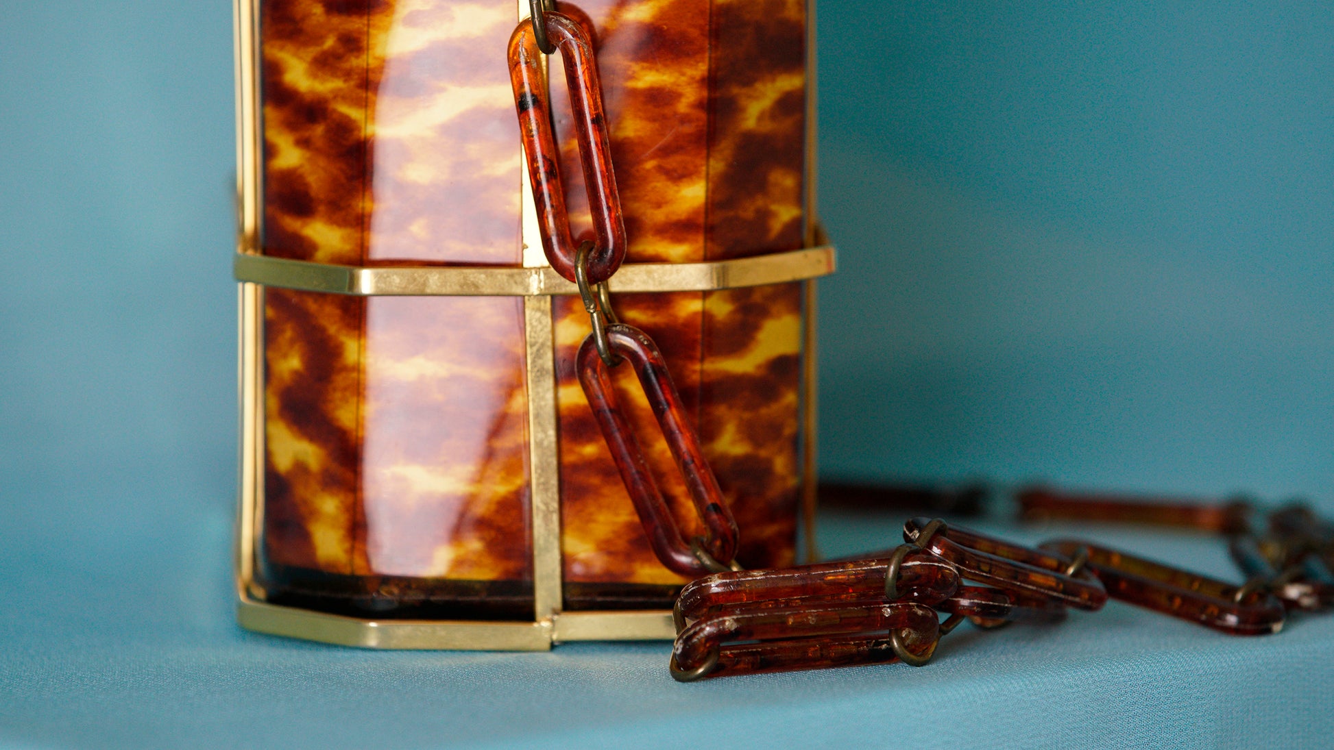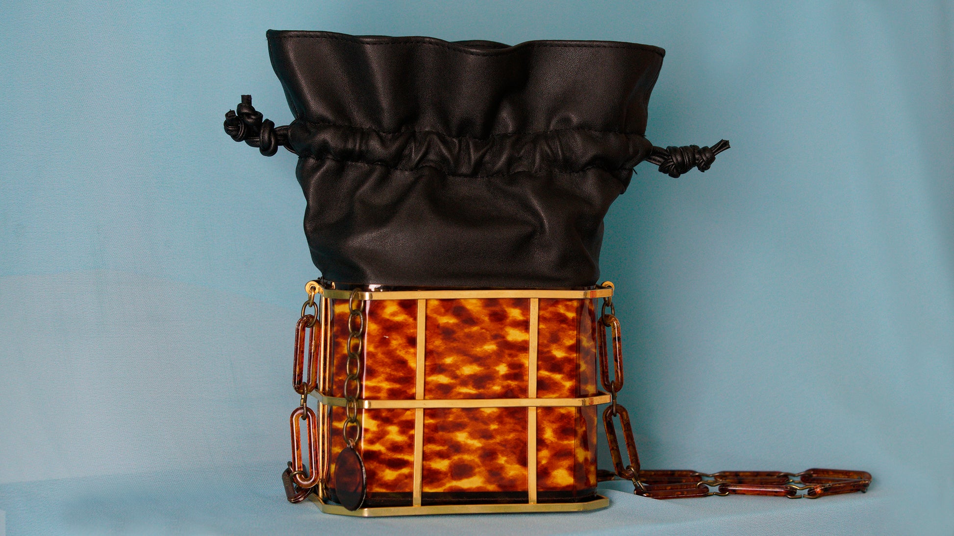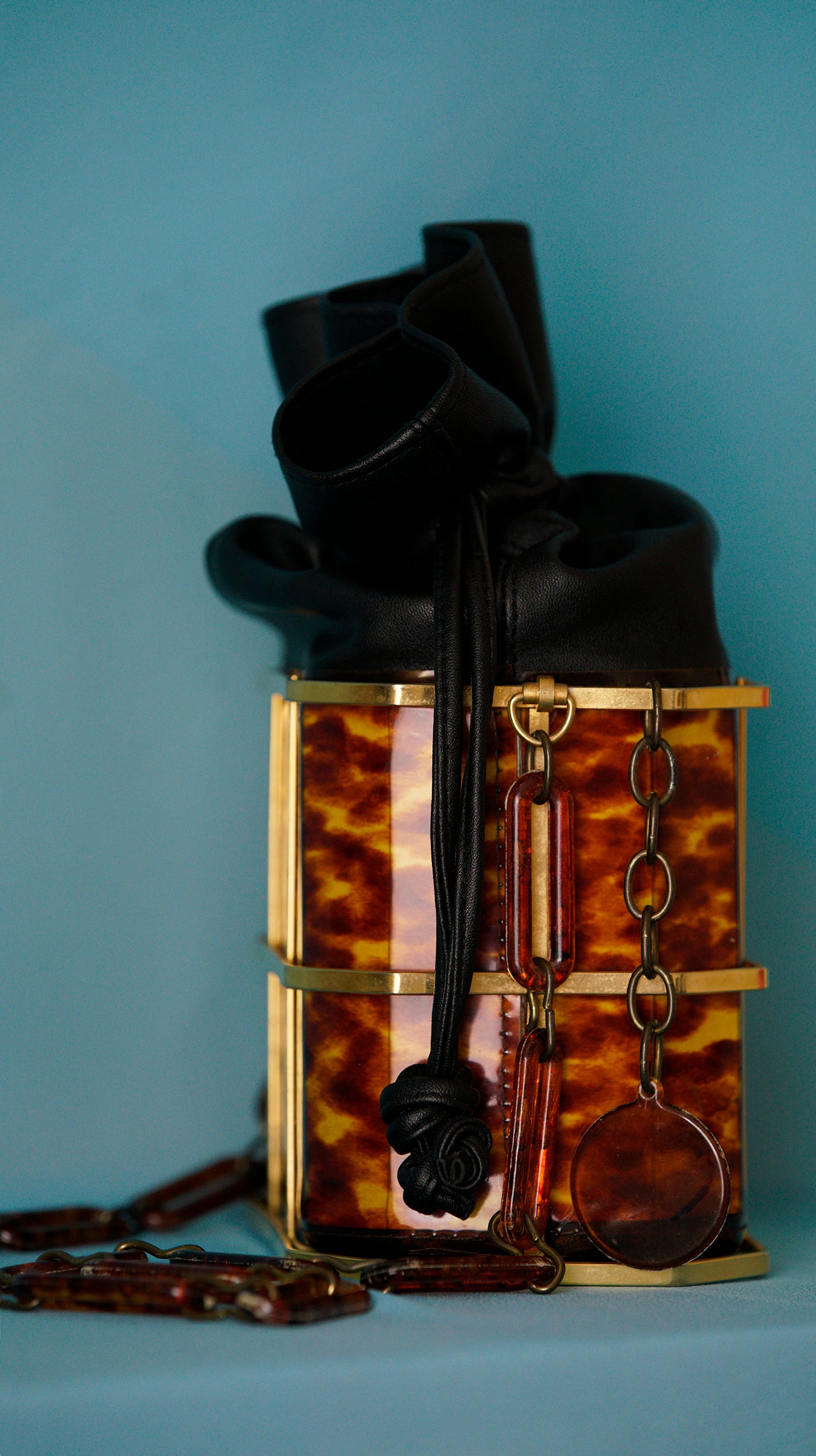 UNIQUE Faux Tortoise Shoulder Bag with Metal and Lucite Embellishments--patent leather faux Tortoise outer-layer and metal shell. Faux leather drawstring top. Very lightweight. GOOD condition, despite some wear and tear on Lucite strap and one break in metal casing (pictured), which has been secured with metal glue. Designer unknown.