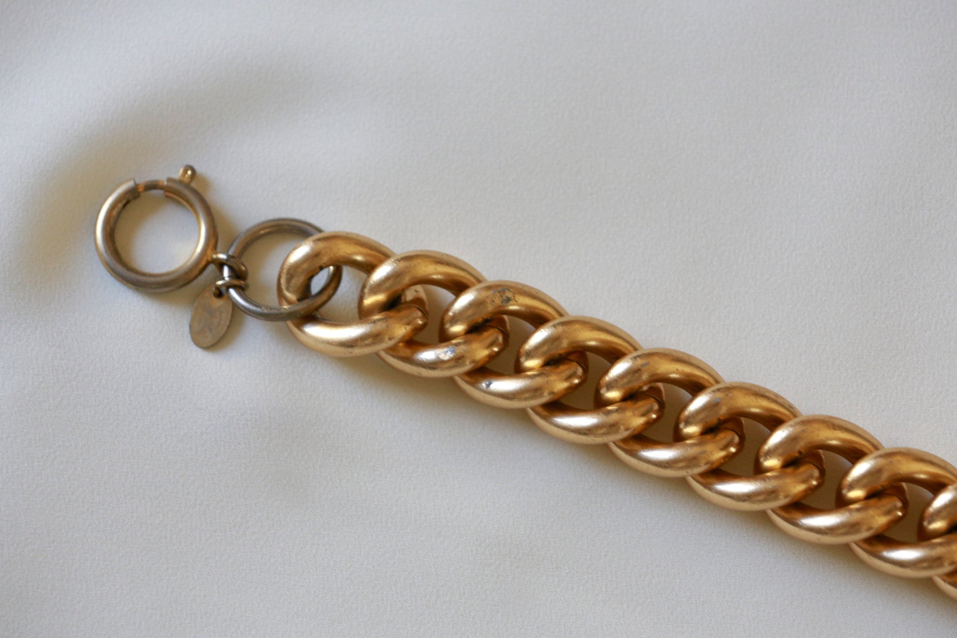 Light weight chunky gold bracelet with spring ring clasp. Please note: gold color has worn off in some parts, but still maintains it's overall appearance.