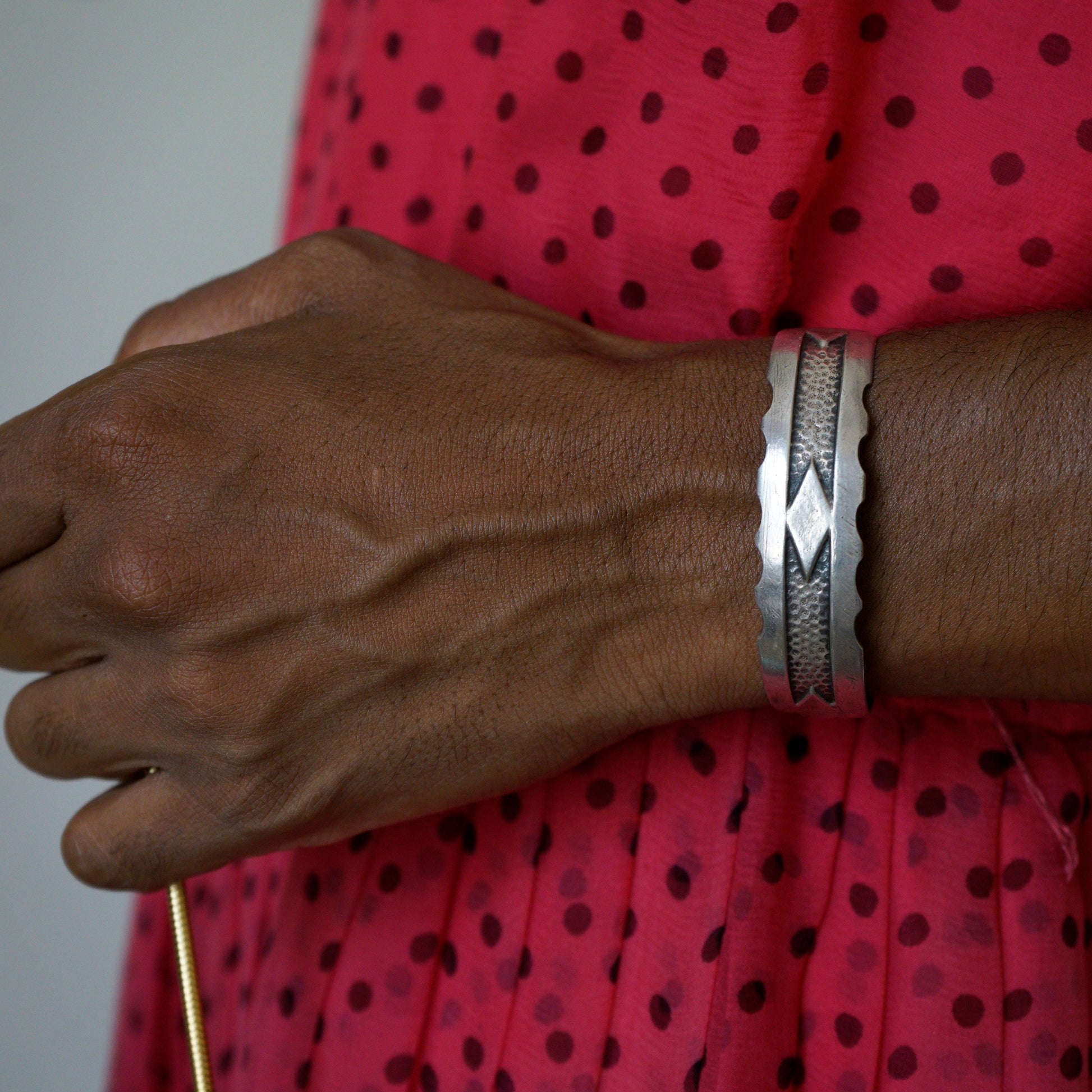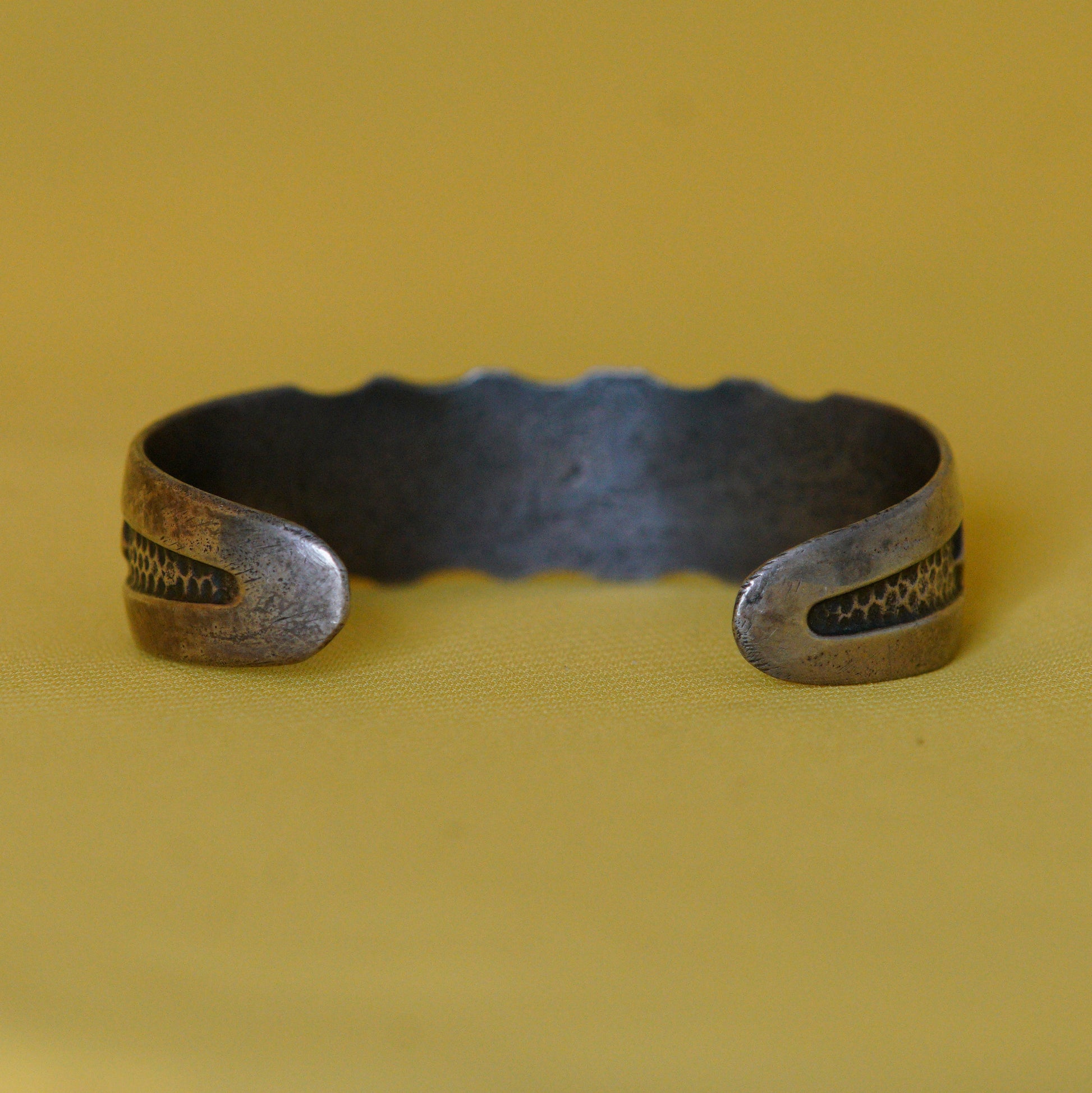 Vintage Silver cuff bracelet (unsigned). Possibly Navajo in origin. Some wear and tear throughout band (pictured). Scratches only visible up-close.