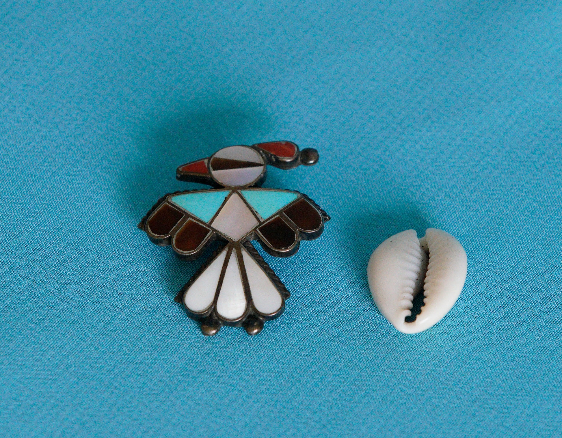 Traditional Thunderbird profile design inlaid with Turquoise, Mother of Pearl, Brown Shell and Coral. The stones are bordered with sterling silver, including a thin rope pattern and appliqued dots, with a pin running horizontally across the back of the wings and body.